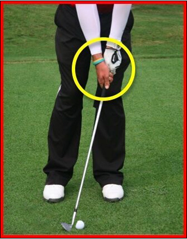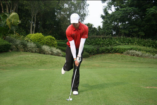 击球准备双手前置。双手应与左大腿排成一条直线。这样会助你在击球瞬间更稳定的向下击球,也会让球产生倒旋。左臂与杆身应形成一条直线。做好上述的步骤,你已经做好了稳定打劈起球或切球的准备了。击球准备最后一步就是瞄球了。