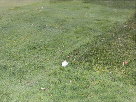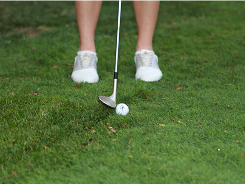 2、将挖起杆前沿瞄在球的正中间,这样挖起杆前沿击球时就像推杆推球一样,动作可以完成的更加自然。