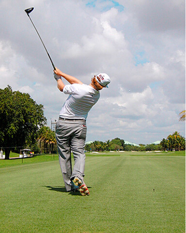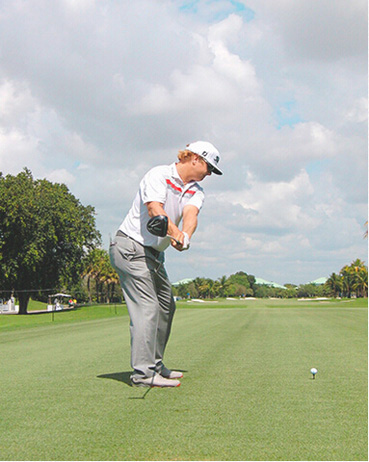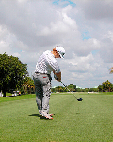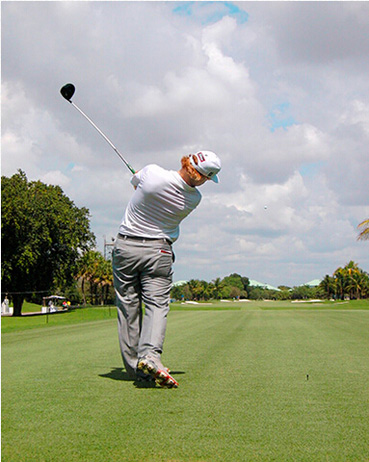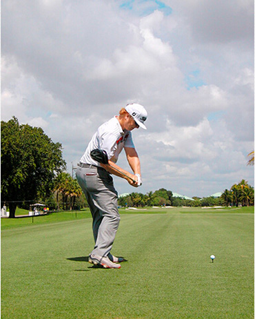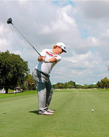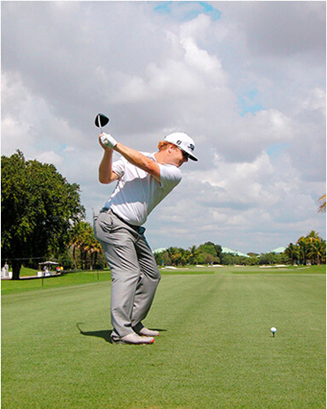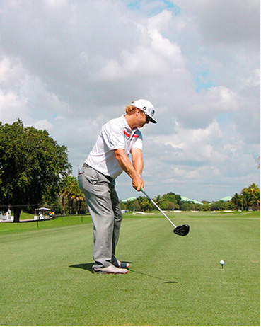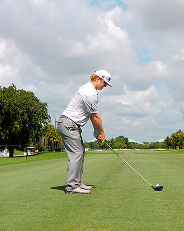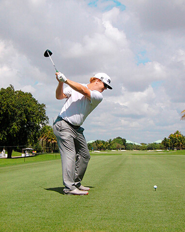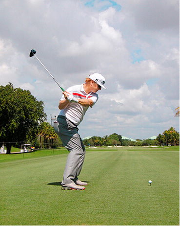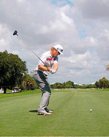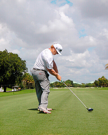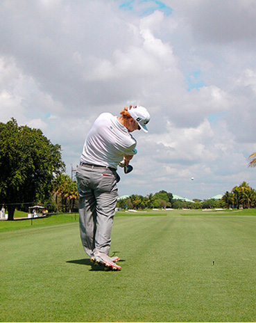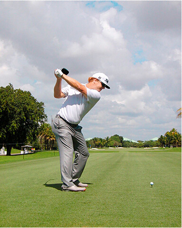 查理·霍夫曼挥杆动作的关键分别体现在三个步骤上,称之为“节奏、转身和下落”。当查理完全遵循这一原则时,他的上杆节奏是完美、顺畅的——他很少会将球杆“甩”到后面。这是“节奏”。脊柱和肩部的柔韧性(他为此在健身房下了不少功夫)使他能够在上杆达到顶点时最大限度地转动肩部。这就是“转身”。前两个步骤是紧密相连的:顺畅的节奏带来更大幅度的肩部扭转,而更大的扭转也激发了更好的节奏。剩下的就是通过下肢回转,同时肩部滞后回转,让球杆沿挥杆平面“落下”。以这样的姿势,几乎不可能出现击球方向失控。模仿查理的上杆动作,那么你的下杆自会浑然天成。