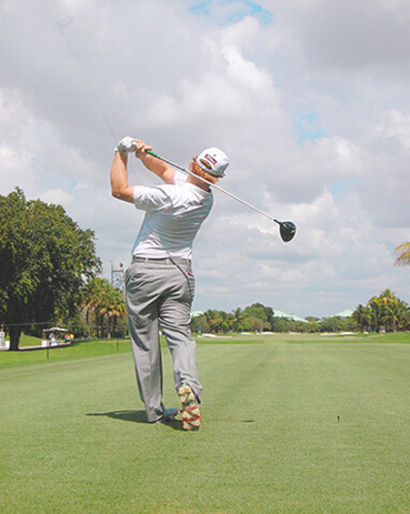 图13 触球后,在查理继续回转的同时,球杆绕过他的身体