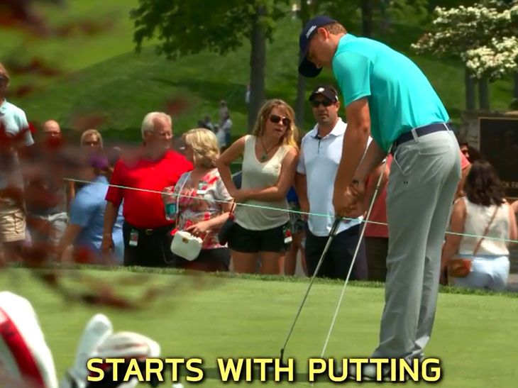斯皮思每天早上会按照一个程序进行练习,包括推杆、切杆、劈起杆、沙坑球和发球木。值得大家借鉴的是:大部分时间,斯皮思都在练习短杆尤其是推杆上面,铁杆跳着号练练就行,长杆热身完毕,还是回到推杆。职业球手都非常清楚,比赛的关键在果岭,果岭致胜在于推杆。