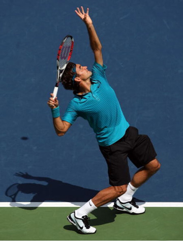 胯部的伸展:网球中一个优质的发球动作,一定是需要伸展胯部才能挥举起双臂,这样做才能使双臂抬高产生力量。