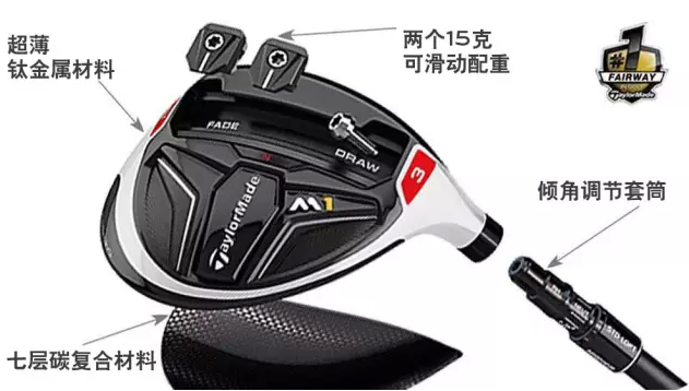 与M1发球杆相同,配备了前置轨道的M1球道木杆,拥有两个15克可滑动配重,球手可使用泰勒梅调节扳手轻松调节并实现左曲球或右曲球。较轻的碳纤维材质冠部设计,使M1球道木杆能配置比R15的滑块更重5克的30克滑块。