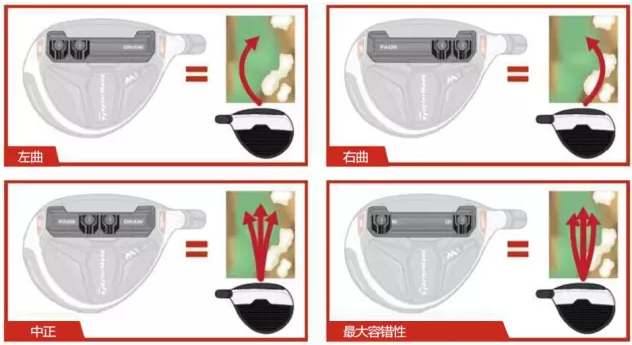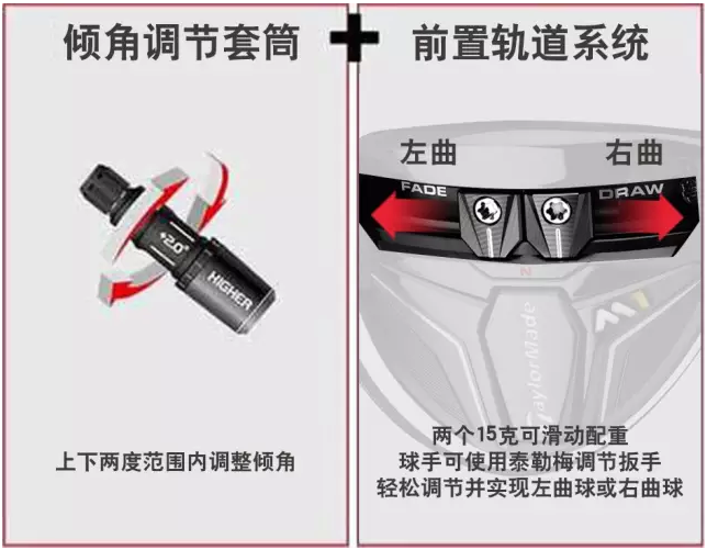 同时,高尔夫球手能够将两个15克滑块分开,以增加球杆惯性,增加误击时的球速,M1球道木杆的前置轨道同样增加了草坪与球杆底部的通过性。M1球道木杆配备了四度的倾角调节套筒设计,球手可于上下两度范围内调整倾角。