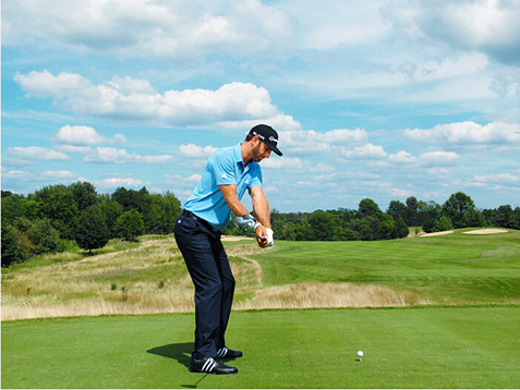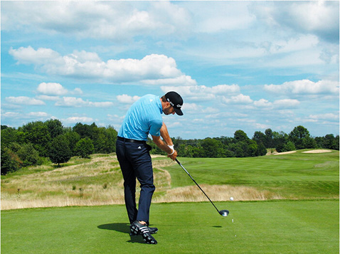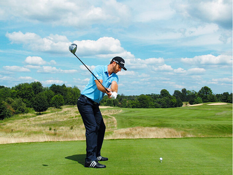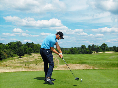 图6 弓起的左手腕和闭合的杆面,让他在大力开球时不必担心打出右曲球