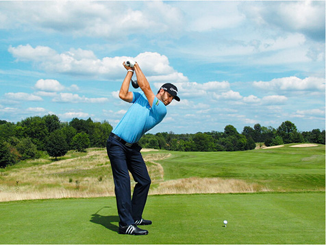 有几个原因可以解释为什么31岁的达斯汀·约翰逊从2008年开始从未在开球距离排名上跌出过前四名,拥有惊人的柔韧性和力量,挥杆幅度虽大但有效。他能以超过120英里/小时的速度驱动球杆,同时又能保持挥杆节奏和速度的平稳。约翰逊独特的挥杆癖好是超强势的右手握杆,这让他的左手腕在上杆至顶点时弓起,且杆面闭合(图6)。这不是教科书式的动作,但在美巡赛上越来越多的球员采用这种强势握杆,因为这让大力击球手们从顶点用力下杆时不再害怕触球过程中打开杆面。如果想学习达斯汀·约翰逊的挥杆,那就模仿他保持右手肘略微超前于右髋部的方式,以及他的右手和手肘是如何自始至终位于球杆之下的(图 9)。让这些动作为你所用,获得和约翰逊相同的击球力量和稳定性。