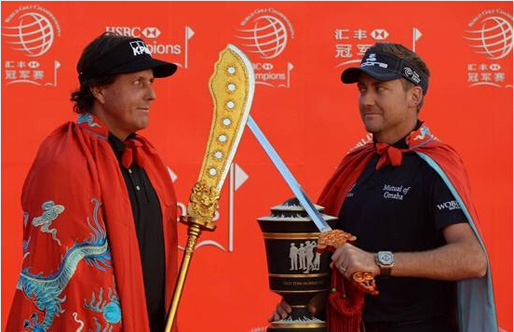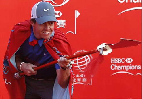 2013年,汇丰冠军赛重回上海,外滩半岛酒店也再次“刀戈相见”。米克尔森、麦克罗伊、保尔特、罗斯和杜夫纳身披龙袍,手持刀枪剑戟,在关公面前玩起了大刀。
