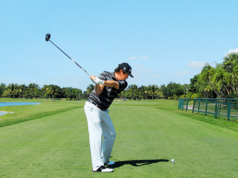 图5 右肘很早就靠近身体了,这减小了挥杆弧半径,但整个动作变紧凑了