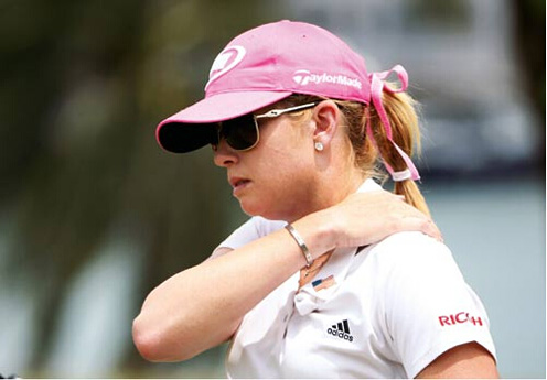 高尔夫球肘学名“肱骨内上髁炎”,它和网球肘的发病原理是一样的,球员挥杆时加速过猛、小臂经常向外旋转、以及屈腕等动作,都会诱发这种伤病。来自宝岛台湾的曾雅妮就饱受肘部伤势的困扰,她的手肘一遇到较硬的场地或是阴冷的天气就会酸痛。