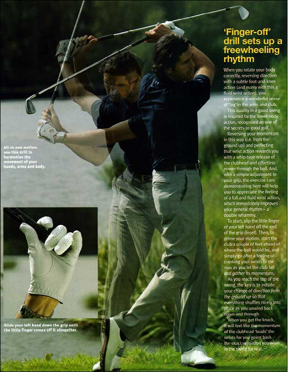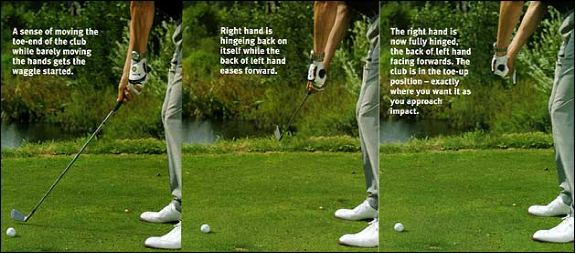 当你能够正确转动身体后,通过双脚与膝盖的动作改变方向,双臂和球杆便能体验“延迟”效果。高质量的挥杆来自下肢动作,这是高尔夫的秘诀之一。按照这种方式改变身体力量的方向,完善手腕运动将帮助你释放杆头,轻而易举地击球。将左手小指放在球杆尾部,从球前方几英尺处击球,然后跟随感觉,最大限度地转动手腕,让球杆自由下落并释放力量。