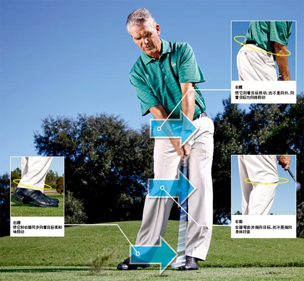 提高铁杆击球稳定性、实现稳固触球的关键在于,以身体而不是手臂和双手来控制球杆。即使你的上肢肌肉非常发达,只要你能够学会利用下肢力量来控制球杆,你就能够明显提高杠杆作用、挥杆速度和控制力。要掌握好铁杆挥杆,你需要专注于3个部位:右髋、右膝和右踝。如果这3个部位的动作是正确的,你很快就能够学会以身体控制球杆。