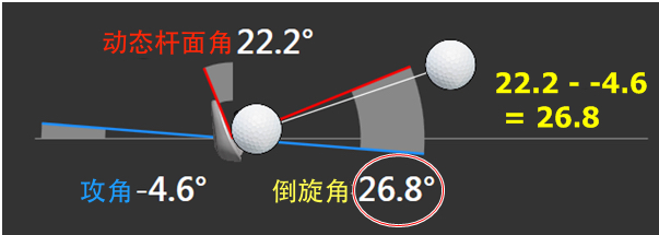 上图清晰显示了一个倒旋角的构成:动态杆面角22.2度减去攻角-4.6度,得出倒旋角26.8度。
