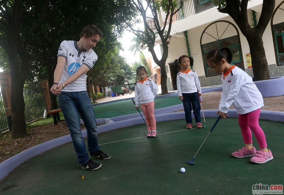 提起贵族幼儿园,不少家长的第一反应就是“天价”。确实,上个幼儿园,一年收费19.8万元!让普通工薪阶层咋舌。但广州最贵幼儿园开班短短两周,号称已经招收了70个学生。图为幼儿园外教在教小朋友打高尔夫球。