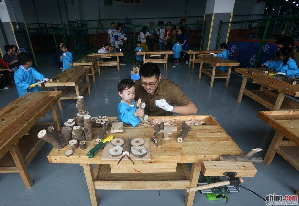 广州最贵幼儿园儿童创意手工工厂,老师向小朋友展示木工区的作品