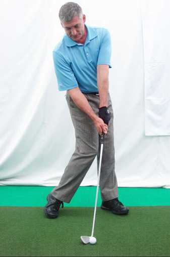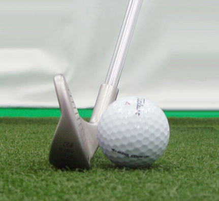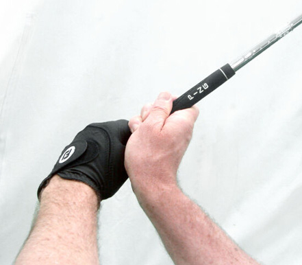 3. 预备姿势时,如果左手腕平,右手腕向后曲腕 ,左手拇指握在握柄中线—— 弱势握杆动作,触球时杆面就会打开。