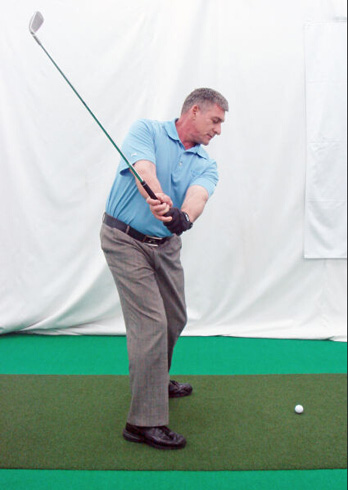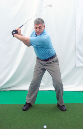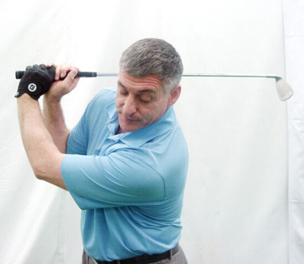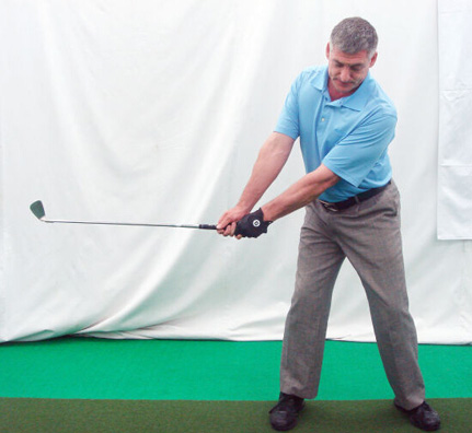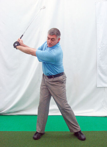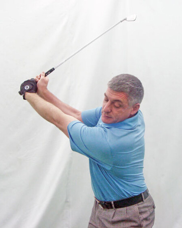 6. 杆身齐腰与地面平行时,右手腕向后曲腕。左手腕平或者稍微曲腕。右臂在身体前方向后挥杆,此动作很关键,这样可以保证杆身平面的正确性。