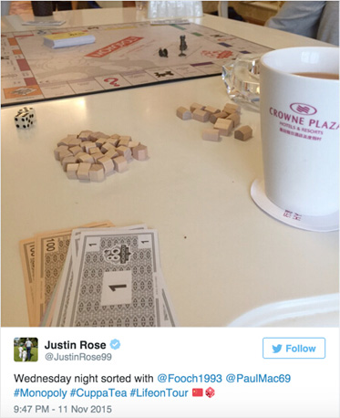 来到上海征战BMW大师赛,罗斯在11月11日“光棍节”当天在推特上传了一张图片,显示自己正在美兰湖皇冠假日酒店里,与球童和好友玩经营类纸上游戏《大富翁(Monopoly)》。