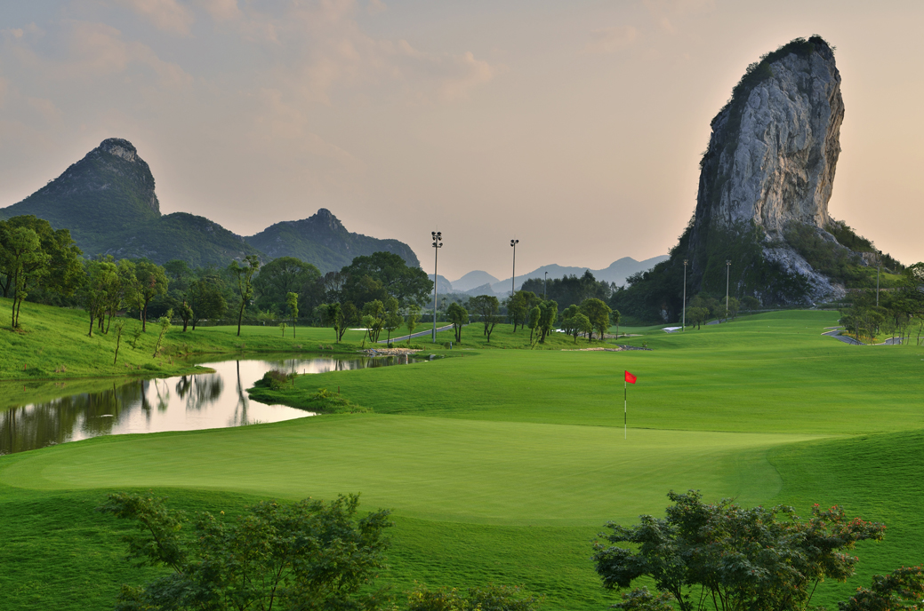 桂林山水秀丽的地貌是球场的主背景,群山环抱,虫鸣鸟叫,而你就是山水画中的那笔经典,融于自然。主图中形如大拇指状的“拇指山”是地标性景观,山下有一深邃的山洞,据传尧帝曾在这里停留,因此得名于“尧洞”,与不远处的尧山彼此呼应。素有“魔鬼洞”号称的6号洞,炮台式的果岭就位于拇指山脚下,球道左右两侧分别为OB区和水障碍,体验才知深浅。