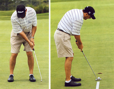 在球洞边找一块平地,使球距离球洞两英尺。在推击路线的中点放一枚球标,使球标对准球洞正中。站位时将球标做为参照物,使球滚过球标,滚向球洞正中。