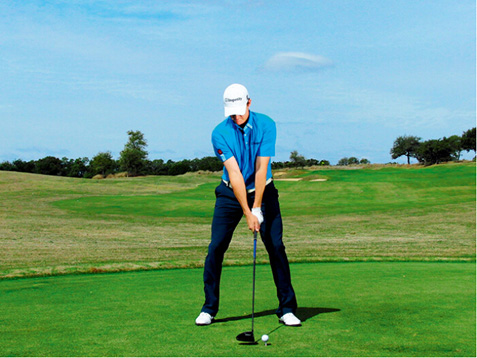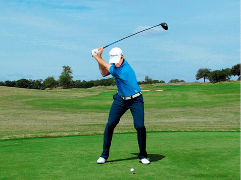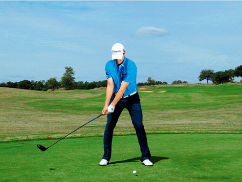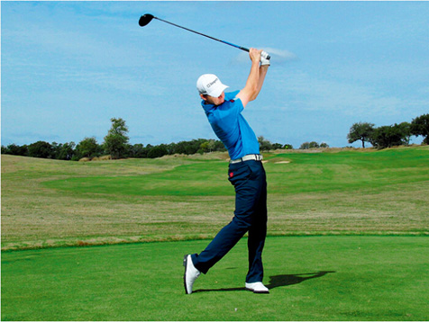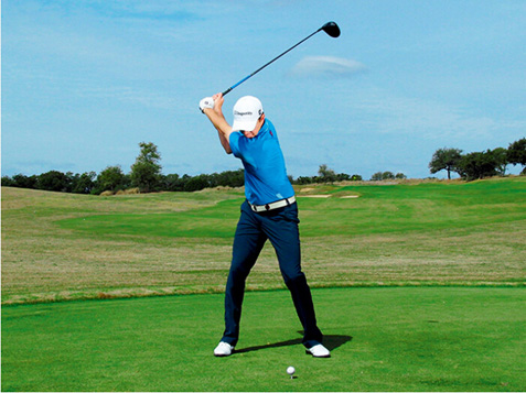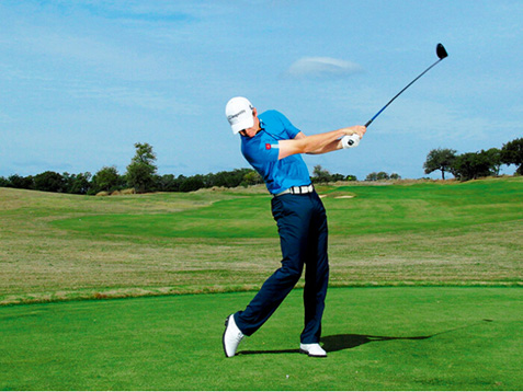 在大学期间,沃克总是会被贴上“十佳球员”的标签,吉米的动作是老式学院派挥杆的改进版。上杆时,臀部保持不动,同时充分转动肩部至90度(图6)。这个类似弹弓的动作促使他能瞬间将球击出300多码,但这个动作要求球员有良好的柔韧性——而这正是现在许多球员缺乏的。学习沃克的挥杆,需要注意在下杆开始时朝目标方向水平移动左膝,然后在触球的瞬间释放。这样,会自然而然地加大下杆过程中的杆头速度。最棒的是?任何人都可以利用左膝移动击出又远又准的开球。