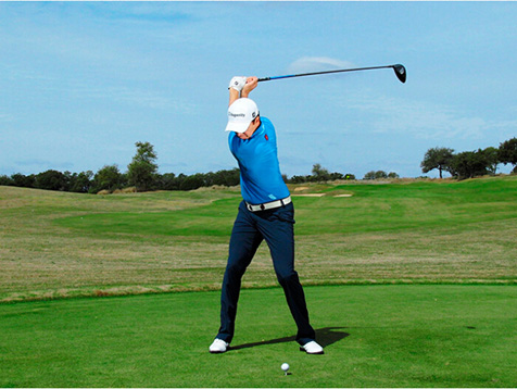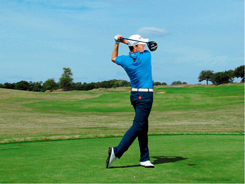 图16 随着臀部和肩部完全转向,吉米的站姿挺直、平稳。完美收杆