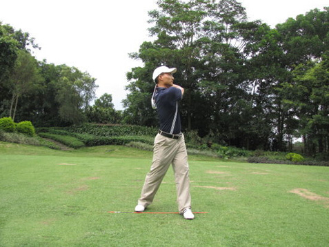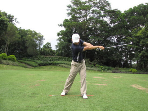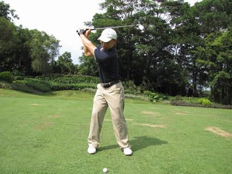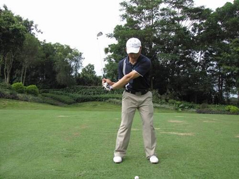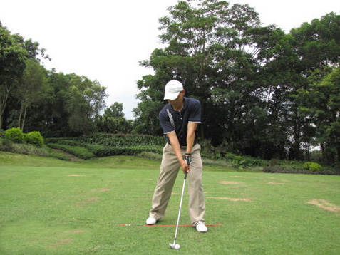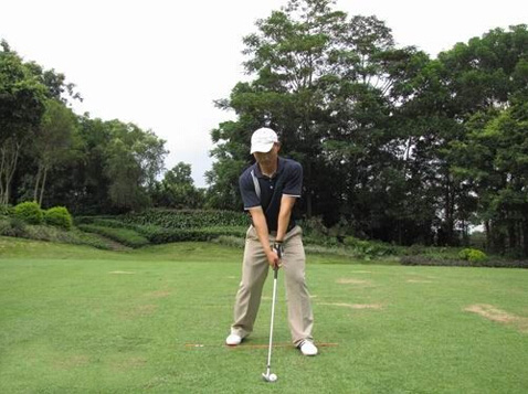 做好站姿,右脚退后一步,进行挥杆练习,整个挥杆过程中直到收杆都不要抬起右脚。一直到你完全能够做到从里往外下杆后,再收回右脚,恢复正常站姿挥杆。