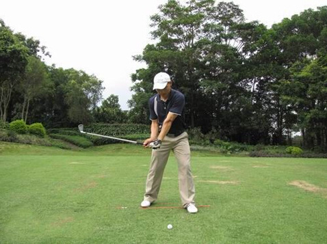 在下杆的过程中,很多球手会出现无法控制下杆轨迹从而无法控制球路的情况。在高尔夫球竞技中,大家都知道小左曲球是最有效的,原因是它的飞行能够远且易控制。小左曲球的下杆轨迹是从里向外的,如何做到从里往外。
