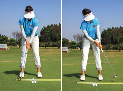 我会找一处较为平坦笔直的地方,来练习约八、九尺的短推。在地上平行摆两支瞄准棒对准洞口,并将一条绳子从球位拉到洞口后方,且使其位于两根瞄准棒中间,然后练习推杆。我会以球标标示固定的摆球位置,让身体平行地上的瞄准棒,并且让双眼位于绳子正上方,也就是球的正上方。在上杆与送杆时,我会让杆头维持在两根瞄准棒形成的轨道内。因为我经常有送杆往左拉的毛病,这能帮我矫正这一点。你也可以在轨道中途再以两根球梯架个较窄的闸门,试着让球通过这个闸门。