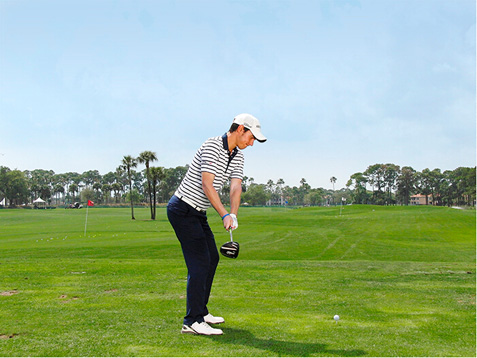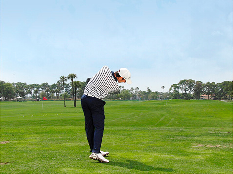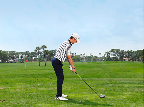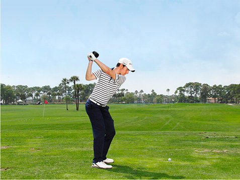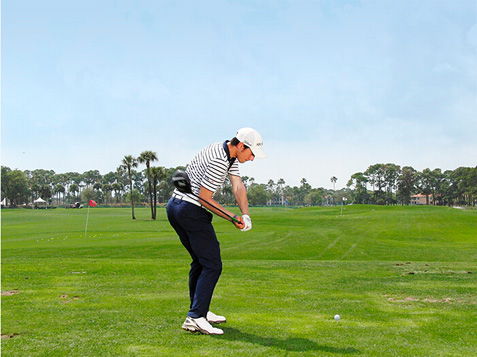 图2 教科书式的上杆前半程,球杆和双手正对脚尖线