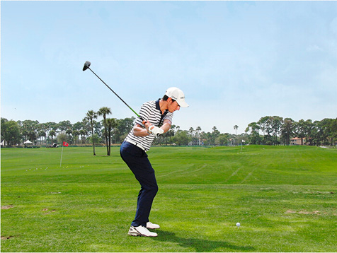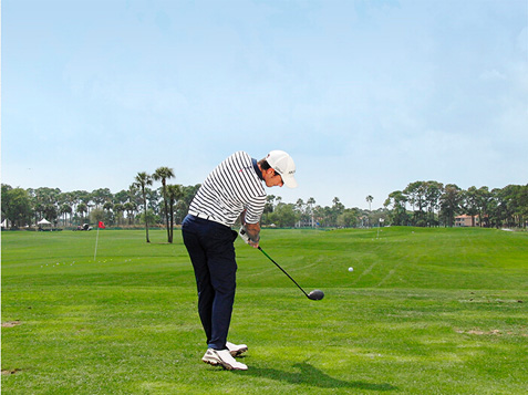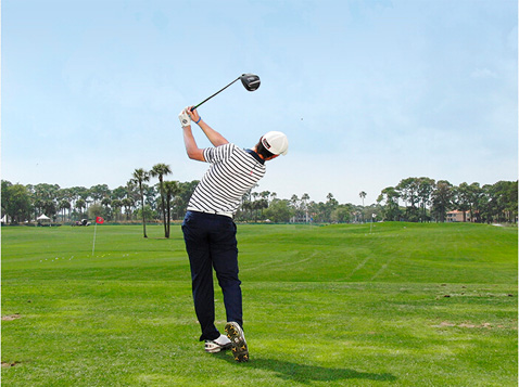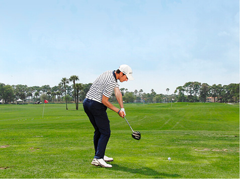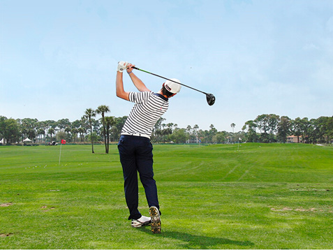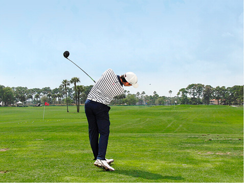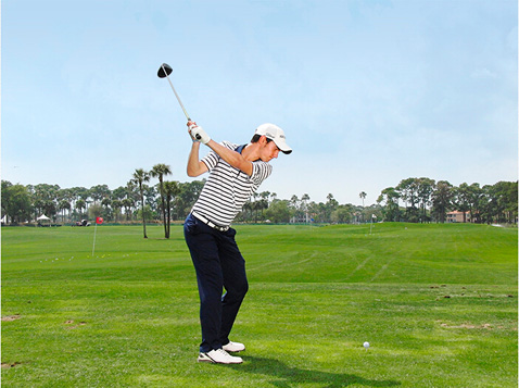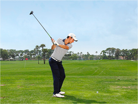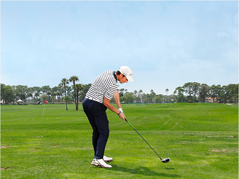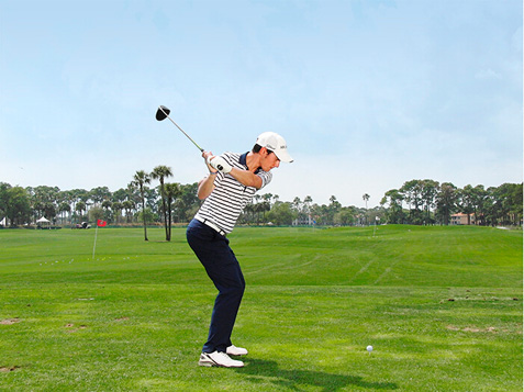 图9 马特欧的下肢做出了柔和的反向卷绕,毫不匆忙。他将把杆头速度最快的一点留到触球时