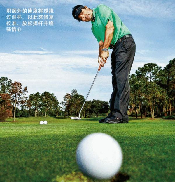 你刚刚错失一个8英尺的小鸟推,这是你原本很有把握推进的球。问题出在哪儿?线路、校准还是挥杆?有时候很难说清楚,但为了搞明白你几乎把自己逼疯。我的建议是:回到起点从头再来。找一处较平坦的10英尺推击然后瞄球。但这一次不要试图推球进洞,而是集中精力让球滚过洞杯。没错——我要你错过洞杯。推击时可以额外用力击球以消除任何可能出现的球路偏转;球应该滚动得足够快,以保持自身的线路并且刚好跳过洞口。如果你没能击中球洞,说明问题出在校准上,因为这是一个直线推击。调整瞄球直到每次都能让球强行跳过洞口。练习10分钟之后,放慢推击速度并尝试让推击进洞。