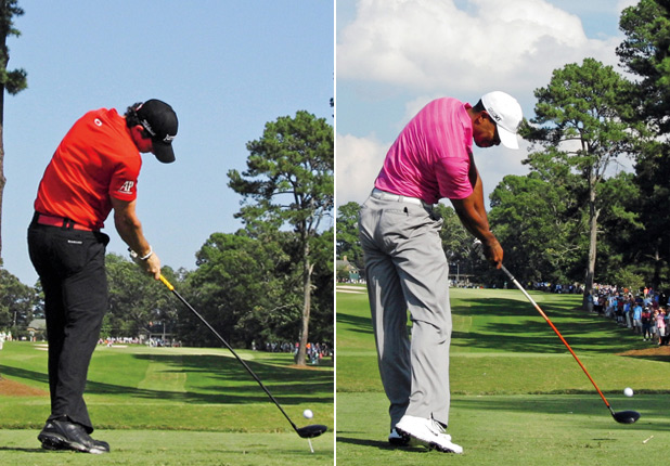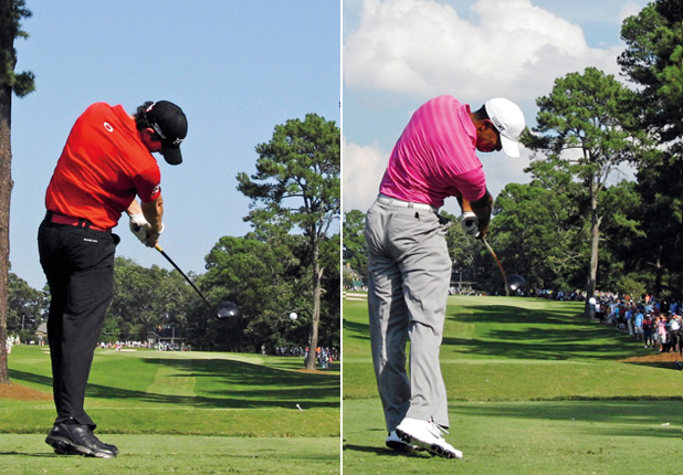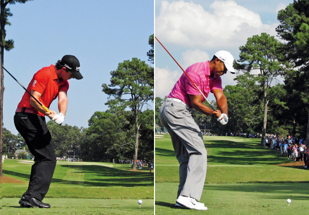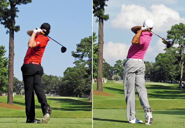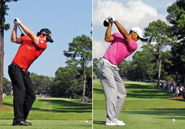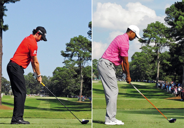 麦克罗伊正向右挥杆,为了打稍稍左曲的球;而老虎正向左挥杆,为了打出稍稍右曲的球。