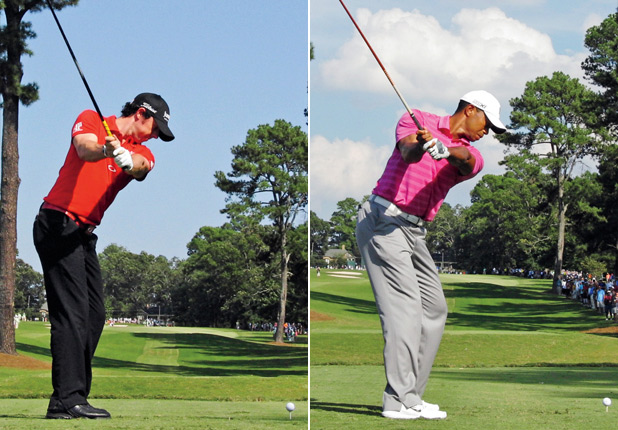 老虎的挥杆更陡直。麦克罗伊的杆身和他的右前臂相匹配,这被看做是标准姿势。