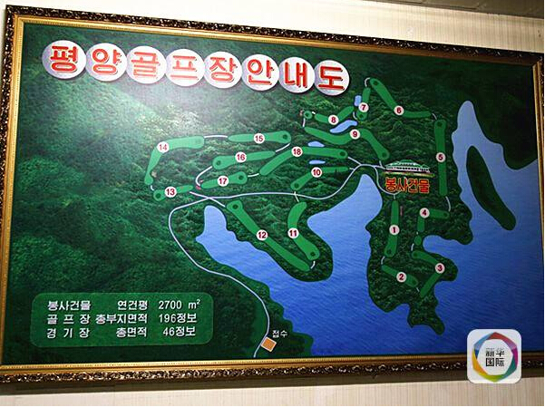 平壤高尔夫球场依山傍水,风景秀美,不仅是驻朝鲜外国人的休闲基地,也是朝鲜人民的娱乐基地和新婚夫妇拍结婚照的外景地。图为球场地图。