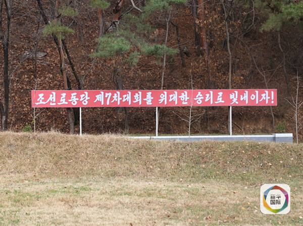 高尔夫球场旁边竖立的标语:“让朝鲜劳动党第7届大会闪耀伟大胜利之光!”