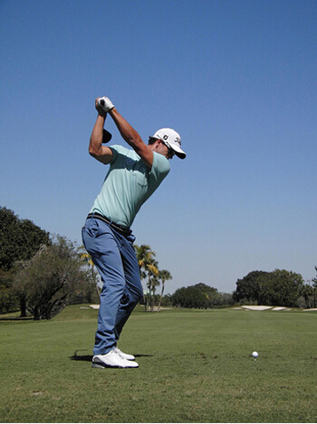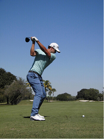人们经常把斯科特的挥杆拿来和他的偶像——格雷格·诺曼相比。但是,亚当的技术实际上更接近2000年的泰格·伍兹,两者都是在布奇·哈蒙的指导下实现的。斯科特沿着右臂平面(球与肱二头肌的连线)挥杆,上杆前半程充分伸展,触球过程中转髋速度很快。巅峰时期的泰格正是这样做的!加上高坛最佳站位,看到的就是保持平衡、提高杆头速度的完美方案。
