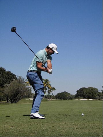 图3 我利用转肩动作启动上杆,感觉自己正在向后转体,将重心移向右腿内侧