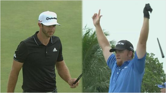 多拉第三轮,达斯汀-约翰逊努力弥补与J.B.霍姆斯(J.B. Holmes)之间的差距。第四洞,三杆洞,他7号铁开球,小球上了果岭之后,直接进洞。二十分钟之后,J.B.霍姆斯同样使用7号铁,让人意想不到的是,他的小球也落到了果岭中央,并一路滚入洞杯之中,他也收获了一杆进洞。