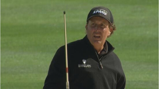 米克尔森在德州公开赛第12洞的球道沙坑中,还剩下154码,他选择8号铁击球。小球出来的时候很柔,只走了100码,当然背后的理由是充分的。米克尔森在击球的时候,杆头打掉了,并且击中了沙坑边缘,最终落到了沙坑之外。米克尔森的反应说明了一切:“搞么鬼?”