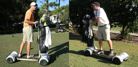 高球滑板车是唐-维尔德曼(Don Wildman)的智慧产物,他是一位常住在美国西海岸的企业家和健身狂人。维尔德曼还是一位狂热的冲浪爱好者和高尔夫玩家,他在夏威夷和加州马利布都有房子,根据以往在冲浪上的感受,他就想着把那种脚踏冲浪板的感觉带到球场上去。他说服了一位好朋友——传奇的冲浪选手莱尔德-汉密尔顿(Laird Hamilton),来加盟这个创造计划。他们尝试了电动滑板,最终创造出了球场滑板车。最初的设计并没有把手,也就是现在的产品上的那种平衡杆,可以让球员抓住的;用户只是把球包背在肩上,然后脚踩滑板车。