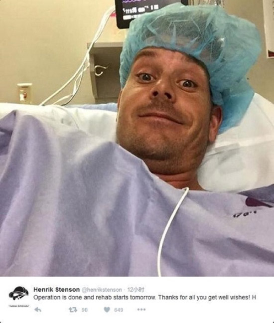 斯滕森在医院中通过个人社交媒体主页,晒出了自己穿着手术装的自拍照,图片中的斯滕森笑容搞怪,显得十分轻松。在配图文字中他写道:“手术已经做完了。明天开始复健治疗。谢谢你们的祝福!”如果一切顺利,他将在明年的欧巡赛的中东挥杆赛开启2016年的比赛。