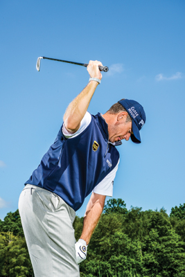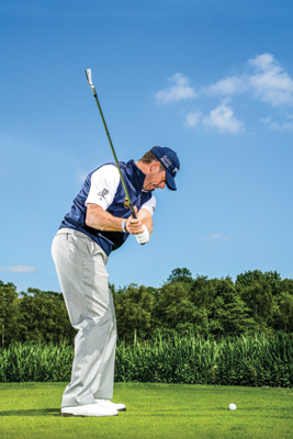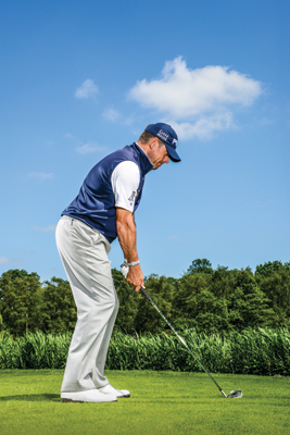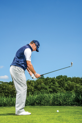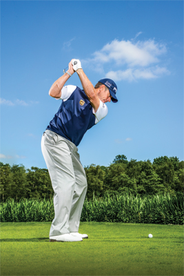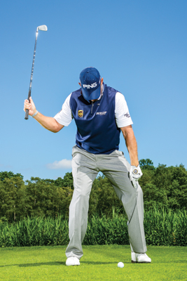我喜欢在上杆顶点时看到有宽度,也就是说双手要舒适地远离头部。这个宽度可以帮助你负载力量到右半身,然后下杆的力量转换可以平顺一些。