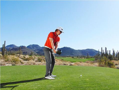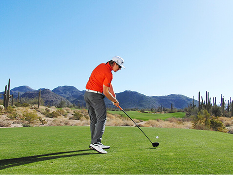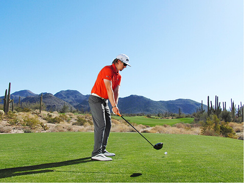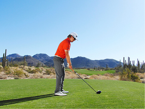 图4 右臂高于左臂,避免放低球杆