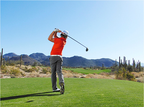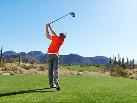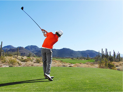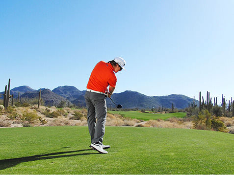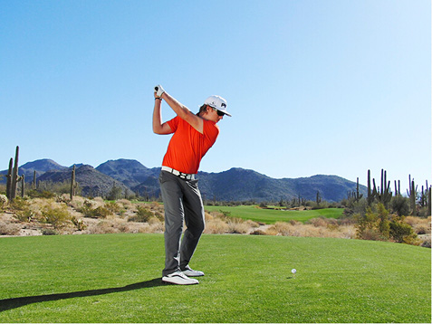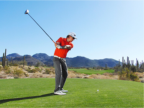 3. 保持转体!收杆时使右侧身体比左侧身体更加靠近目标。
