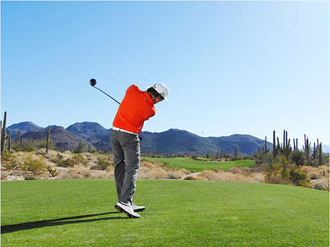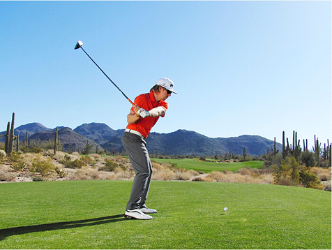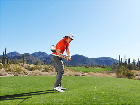 图7 髋部反向卷绕,上体没有转动,球杆仍然保持在较高位置