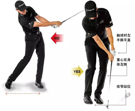 将球置于站位中靠后一点,左脚后撤几英寸略微闭合站位。挥杆时,让球杆在释放中翻转,收杆时让球杆与脊柱垂直。