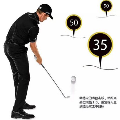 与布奇·哈蒙在他位于拉斯维加斯的练习场训练时,会对着他放在场地里的金属盘打无数的挖起杆击球。锁定一个码数,挑选合适的挖起杆,然后做几次空挥杆练习,获得对球杆、距离和理想球路的感觉。当打出期望的击球,金属盘就会被击中发出响声。面对每一个“靶心”,会特别注意挥杆速度,这样在比赛中面对相似的码数时就能重复这种挥杆。在练习场不断重复这个训练。重复是关键。只要复制这类训练,就能以更加积极、正面的心态对待短距离攻果岭击球。不一定非用金属盘——毛巾、洞旗或任何能在练习场找到的目标都可以。