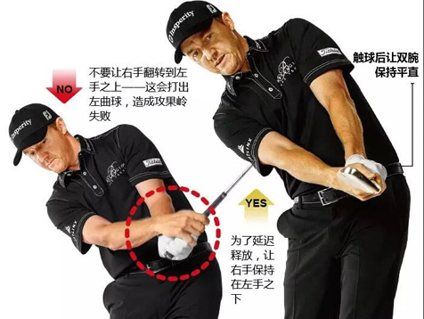 释放动作是这类击球的重要元素。当挥杆通过球位时,试着不要让右手翻转到左手之上。练习时,训练触球后让双腕保持平直(右图)。这是终极抗左曲释放,它能保证打出自左向右的球旋。直腕式小右曲球不仅适用于传统的得分球杆,也适用于长铁杆。