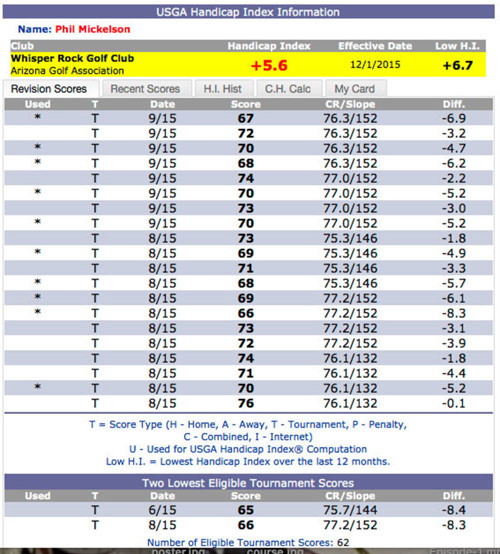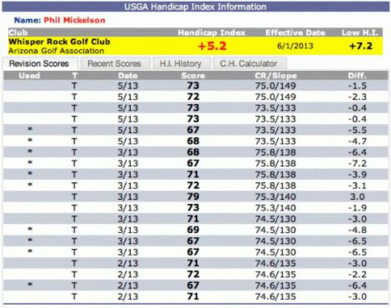 其实米克尔森一直以来都有计算自己差点的习惯。2013年的一篇文章中就曾报道,他将自己在美巡赛上的每一轮成绩都直接录入到差点系统中。