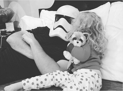 亨特-马汉头戴白兵头盔,与女儿躺在床上,画面十分温馨。